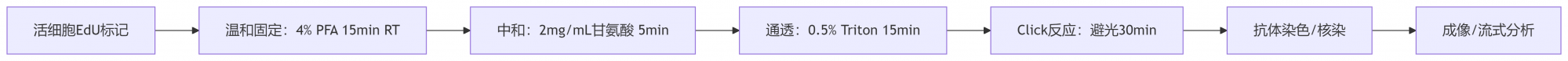 →固定: 使用新鮮配制、pH 7.4的4%多聚甲醛(PFA),室溫固定≤15分鐘。過度固定(>30min或高濃度戊二醛)會嚴(yán)重遮蔽抗原和EdU位點(diǎn)。