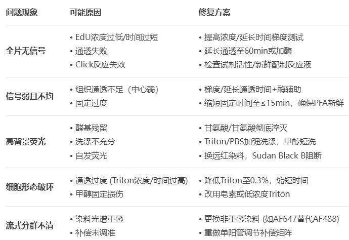 →對照實驗必做: 包括未加EdU陰性對照、已知高增殖陽性對照,以及濃度/時間梯度測試。