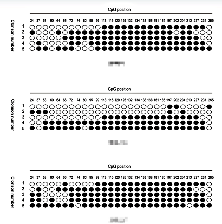 亞硫酸氫鈉測(cè)序法是一種可靠性及精確度很高的方法,能明確目的片段中每一個(gè) CpG 位點(diǎn)的甲基化狀態(tài)。在尋找有意義的關(guān)鍵性 CpG 位點(diǎn)上,有其他方法無(wú)法比擬的優(yōu)點(diǎn)。測(cè)序法以 CpG 島兩側(cè)不含 CpG 點(diǎn)的一段序列為引物配對(duì)區(qū),所以能夠同時(shí)擴(kuò)增出甲基化和非甲基化靶序列。它的不足是耗費(fèi)時(shí)間和耗資過(guò)多,至少要測(cè)序 10 個(gè)以上的克隆才能獲得可靠數(shù)據(jù),同時(shí)需要大量的克隆及質(zhì)粒提取測(cè)序,過(guò)程較為繁瑣、昂貴。