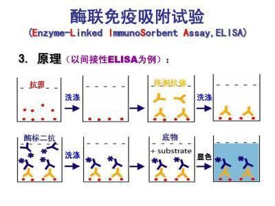 ELISA試驗(yàn)基于抗原-抗體特異性結(jié)合的原理,通過(guò)酶標(biāo)記的二抗與一抗結(jié)合,形成酶標(biāo)抗體-抗原-抗體復(fù)合物。隨后,加入底物使酶發(fā)生催化作用,生成有色產(chǎn)物,產(chǎn)物的顏色深淺與待測(cè)樣品中抗原或抗體的濃度成正比。通過(guò)比色測(cè)定,可以實(shí)現(xiàn)對(duì)目標(biāo)分子的定量分析