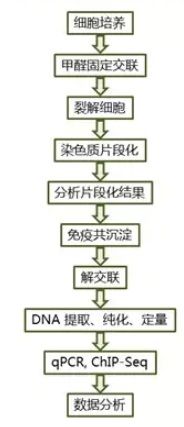 ①細(xì)胞交聯(lián)與裂解:使用甲醛固定細(xì)胞內(nèi)蛋白質(zhì)和DNA的相互作用,然后裂解細(xì)胞釋放染色質(zhì)。