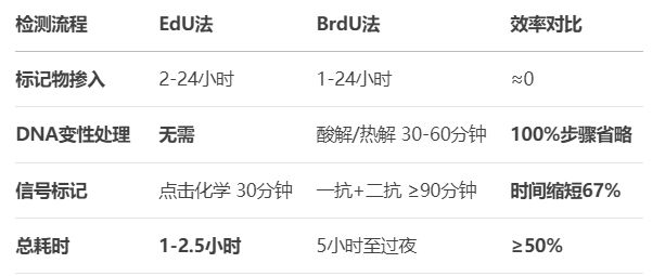 傳統(tǒng)BrdU法需經(jīng)歷DNA變性(酸/熱解)、一抗/二抗孵育(≥90分鐘)、多次洗滌等冗長步驟,總耗時 5 小時至過夜(約 17 小時)。而EdU檢測僅需三步核心操作: