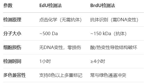 ①①分子量優(yōu)勢:EdU(非染料,其檢測探針為熒光疊氮化物)分子量僅為 BrdU 抗體的 1/500(~500 Da vs ~150 kDa),可自由穿透細(xì)胞膜與核膜,無需對細(xì)胞進(jìn)行強制變性處理