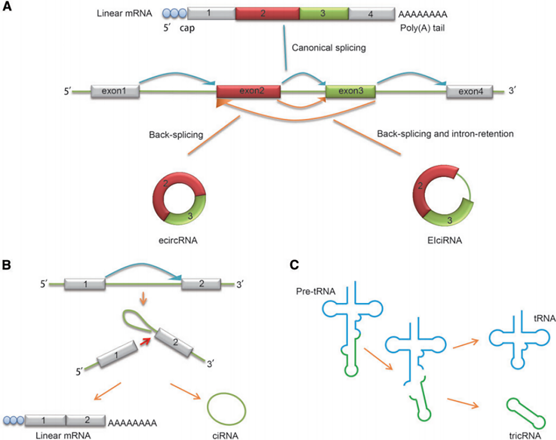 目前發(fā)現(xiàn)的circRNA主要來(lái)源于基因外顯子,但多項(xiàng)研究也表明circRNA的類(lèi)型比想象的要復(fù)雜,可以來(lái)自基因組上多種基因結(jié)構(gòu)。目前最常見(jiàn)的circRNA來(lái)源于外顯子,其5'和3'末端共價(jià)連接,形成“頭尾”連接的EcircRNA。EiciRNA是環(huán)狀RNA的一種特殊亞型,存在于哺乳動(dòng)物細(xì)胞中。EiciRNA由編碼基因的外顯子序列和內(nèi)含子序列組成,不同于只由外顯子序列組成的EcircRNA(圖三A)。真核的剪接體內(nèi)含子可以形成環(huán)狀內(nèi)含子RNA。 在5'-外顯子釋放后,終端3'-OH攻擊3'-剪接位點(diǎn),產(chǎn)生ciRNA并釋放3'-外顯子(圖三B)。作為一類(lèi)特殊的內(nèi)含子circRNA,tricRNAs在pre-tRNA剪接過(guò)程中產(chǎn)生。tRNA剪接核酸內(nèi)切酶復(fù)合物通過(guò)識(shí)別pre-tRNA中的凸起 - 螺旋 - 凸起基序并在反密碼子環(huán)內(nèi)切除tRNA內(nèi)含子,然后連接釋放的末端,產(chǎn)生tRNA和tricRNA(圖三C)。