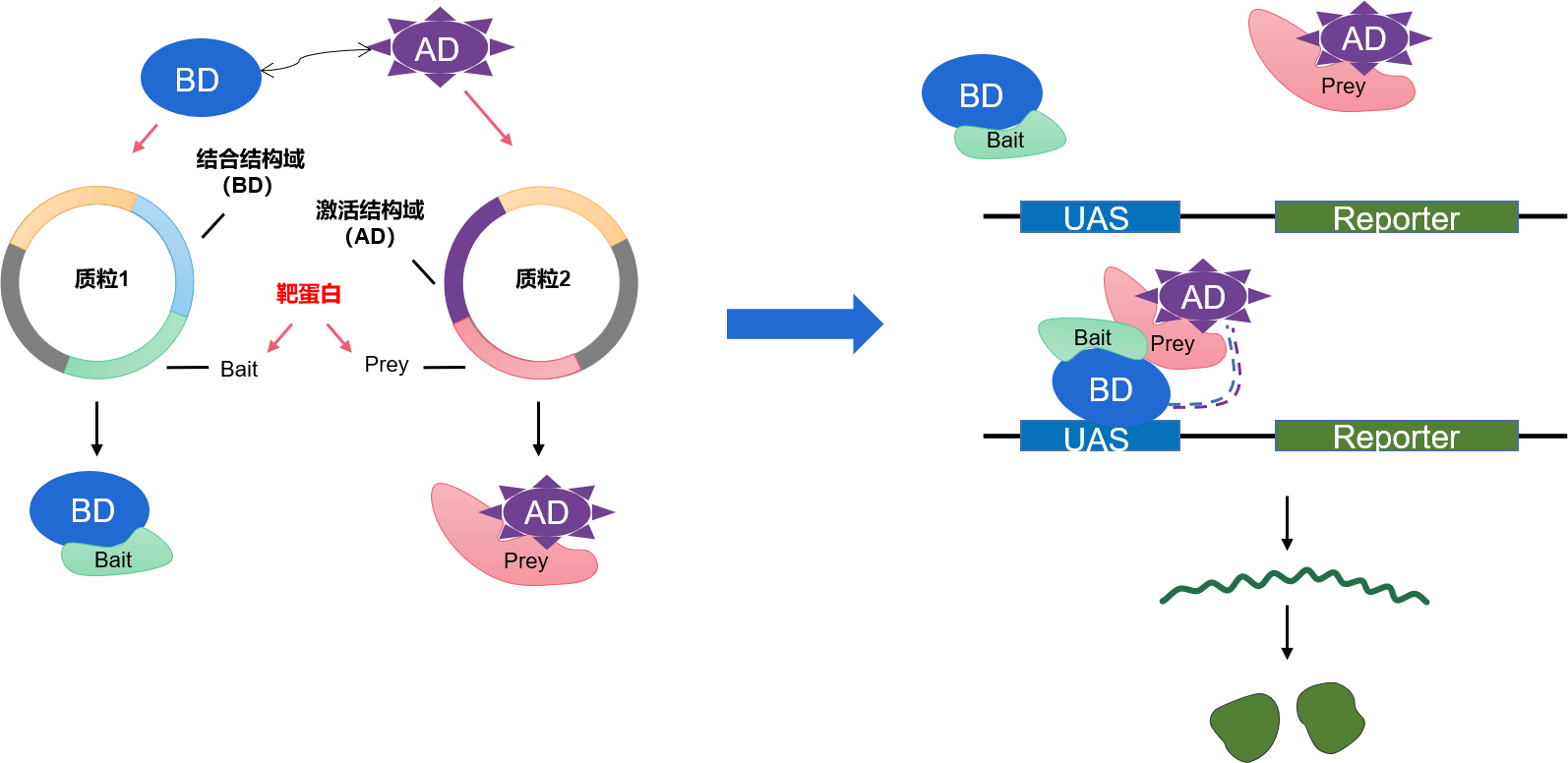 酵母雙雜交系統(tǒng)是將待研究的兩種蛋白質(zhì)分別克隆(融合)到酵母表達(dá)質(zhì)粒的轉(zhuǎn)錄激活因子(如GAL4等)的DNA結(jié)合結(jié)構(gòu)域(DNA-BD)和轉(zhuǎn)錄激活域(AD)上,構(gòu)建成融合表達(dá)載體,從表達(dá)產(chǎn)物分析兩種蛋白質(zhì)相互作用的系統(tǒng)。