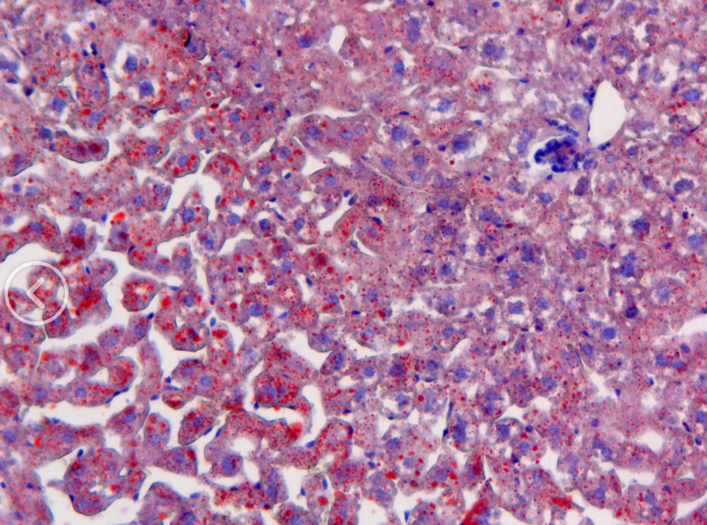 油紅O染色液主要用于顯示組織器官的脂肪變性和類脂質的異常沉著,常發(fā)生于肝、腎、心等實質臟器的脂肪變性,細胞內出現(xiàn)多數(shù)中性脂肪滴;鑒別和診斷脂肪組織中所發(fā)生的腫瘤及其性質。標本不采用含有乙醇的固定液(如需要固定可采用 10%的福爾馬林)、也不采用石蠟切片,需用冰凍切片或碳蠟切片。脂肪的陽性染色結果呈橘黃至紅色,但具體顏色因脂質濃度而定。